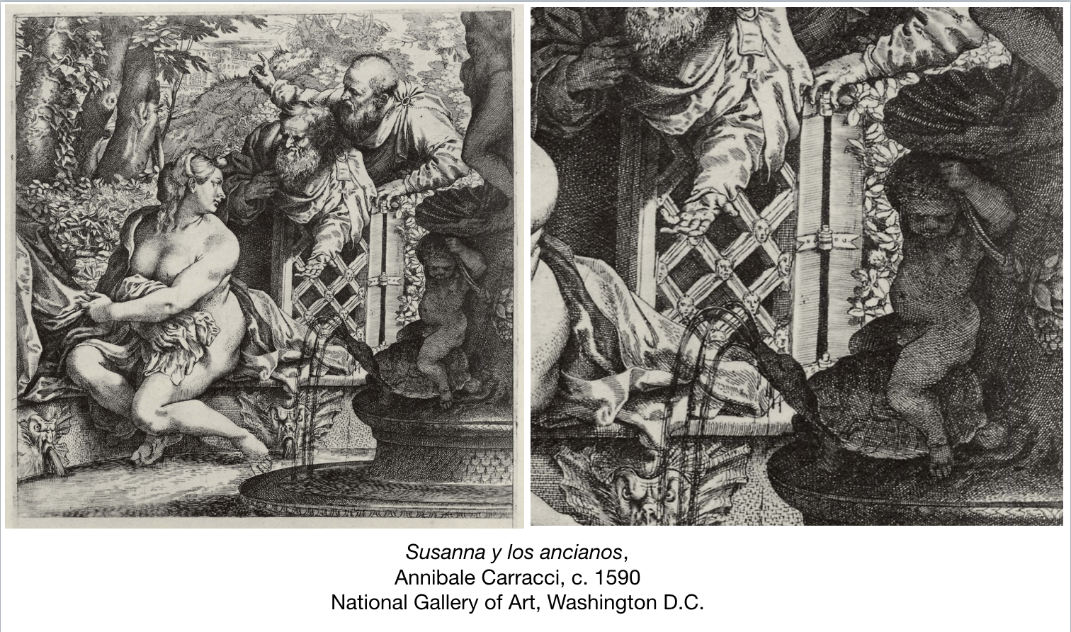 Frente a la sociedad, tanto culturalmente como en la práctica científica, el hombre es el parangón de estudio, relegando el papel femenino a un segundo término. Y en la visión otorgada por esta jerarquía, una siempre es la Susanna de Anibale Carracci. En su disegno vemos como el artista multiplica la imagen de los hombres contemplando a la mujer en la puerta del jardín. En vez de un par de ancianos, tenemos un ejercito de miradas atacando el cuerpo de Susanna, mientras ella parece apacible. El único que parece no mirar es la escultura de un putto, que apenado por la escena parece evadirle con la mirada. En nuestra sociedad, las víctimas de relaciones de poder son retratadas como femme fatales, en donde su belleza o juventud parece ser el peor argumento en su contra. Y nosotros, en vez de intervenir aunque fuese en nuestros propios cuestionamientos acerca de estas relaciones muchas veces decidimos hacer cual niño de la fuente, aunándonos a la condena de Susanna sin cuestionarnos acerca de las implicaciones éticas de la experiencia que contemplamos.