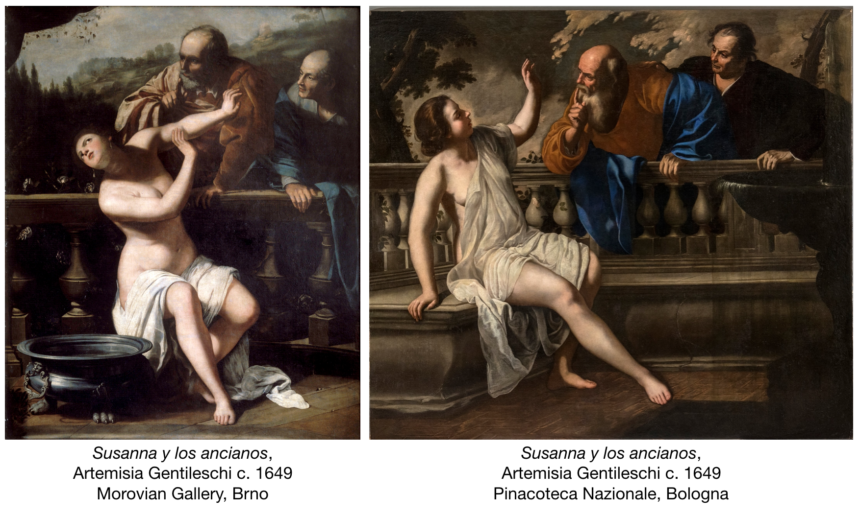 En la historia bíblica, Susanna, una mujer joven, es espiada por dos ancianos amigos de su esposo mientras ésta toma un baño en el jardín de su casa. Los hombres demandan que Susanna tenga relaciones sexuales con ellos o sino la acusarán falsamente de adulterio. El señalamiento implicaba su muerte lapidada, destino que ella prefería antes de yacer con los ancianos. Al momento del juicio, el profeta Daniel, inspirado por una voz angelical, decide cuestionar de manera separada a los “viejos feos” encontrando contradicciones frente a sus testimonios. El profeta revela la treta en contra de Susannah, marcándola como epígono de virtud para la posteridad; pero a los artistas masculinos raramente les interesó representar esto.