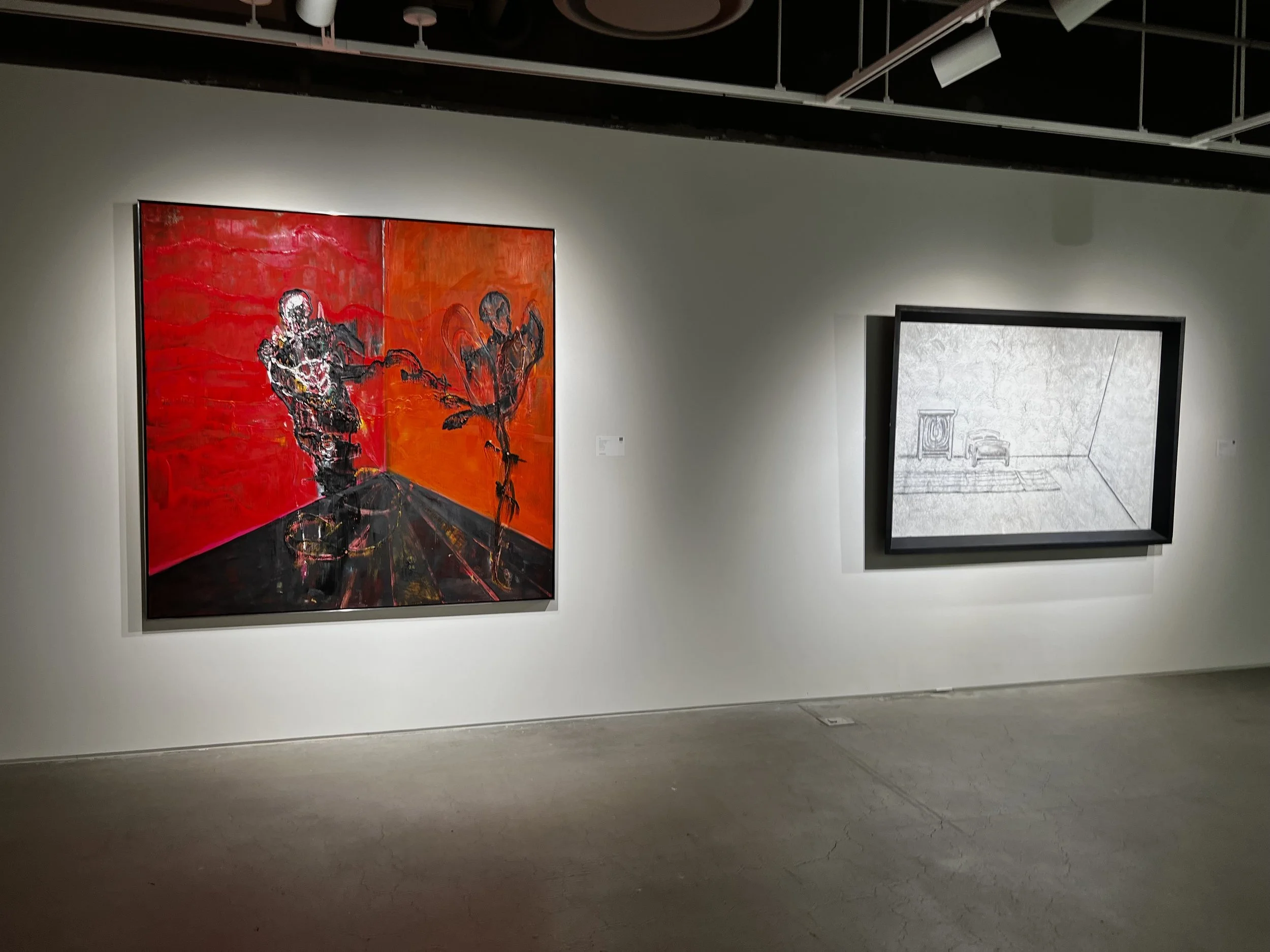 In Dance with the Devil (2020) a man is connected to a parallel entity composed of a smoke-like texture, which stands as a spectrum to his own existence. Attached to this double by way of his upper limbs, the main figure stands distorted while remaining recognizable as an anthropomorphic being through his fully rendered core. The figures appear to skirt the limits between existence and decay, while being immersed in a crimson prism reminiscent of the polychromy applied by Francis Bacon in his 1962 triptych, Three Studies for a Crucifixion (see fig. 1). In a cube composed of red, orange and black, Townley’s figures seem to participate in a phantasmagorical dance while waiting for the scene to achieve absolute darkness.
