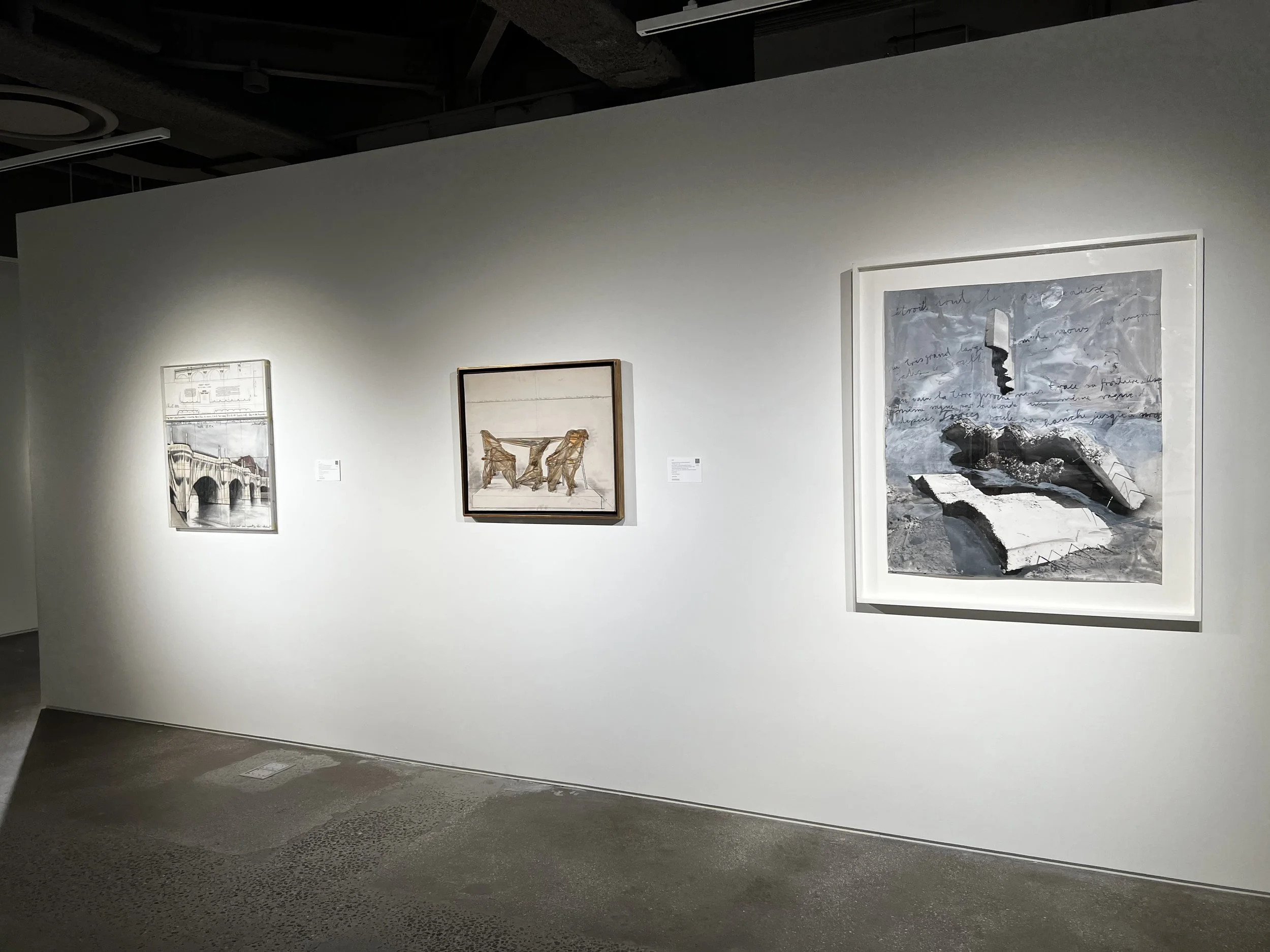 Wrapping objects in fabric, paper or plastic, Christo and Jeanne-Claude alienate them from their conventional roles. Landmarks and monuments are shrouded to efface their intricate decorations and immediately recognizable features. The most stimulating innovation to ready-mades since Marcel Duchamp, the artists return these objects to their inherent state, estranging them from their surroundings and bathing them in a new poetic aura. In the drawing Deux chaises et table empaquetées, two chairs and a table drawn on paper are covered in fabric and tied with cords to suggest their wrapping. Through their concealment, we are confronted solely with their sheer subjacent form within the fabric. Devoid of any functionality, the pieces force the viewer to contemplate them strictly aesthetically based on their outlines. Objects become pure form and texture. Christo and Jeanne-Claude highlight the latent potential of any object to provoke wonder once it has been packaged for our aesthetic consumption.