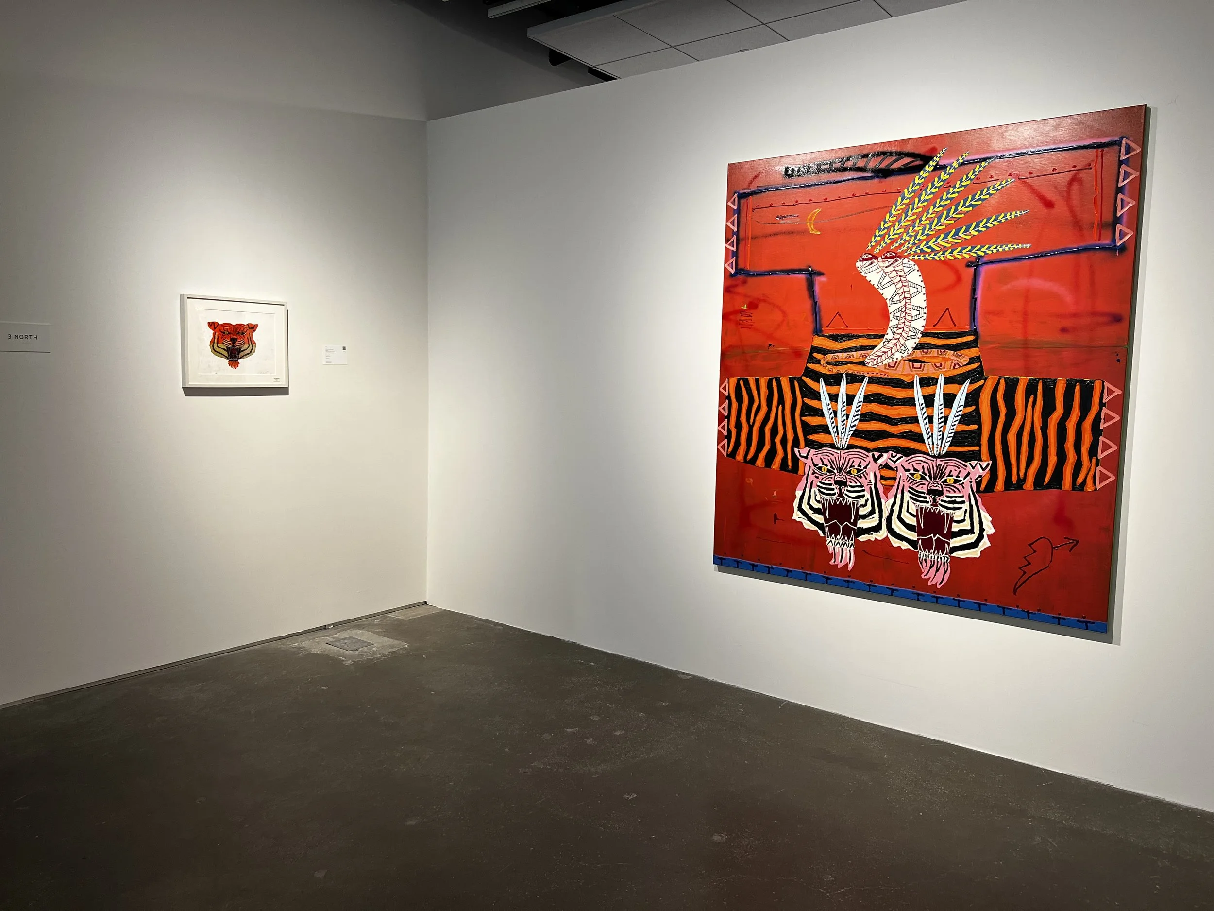 In a scene informed by cubism and the aesthetics of graffiti, Kerwick presents to us the pelt of his instantly recognizable tigers, decimated and affixed into the wall, yet somehow, no less intimidating. Half graffiti-sketch, half a construction of heavy brushstrokes with two pink roaring heads affixed into the body, the double headed tiger possesses the increasing vibrancy of an entity gradually arising into existence. Its roaring stance is replicated by the hissing of Kerwick’s signature double-headed snake, granting the scene with an almost sonorous quality. Recreating the illusion of rusted metal, the background serves as a solid point from where these cut-out figures appear to have gathered. Trading movement for resonance, Kerwick’s compositions exploit the advancements in art provided by Matisse for the creation of a vibrant composition that speaks with the sonar effervescence of counterculture.
