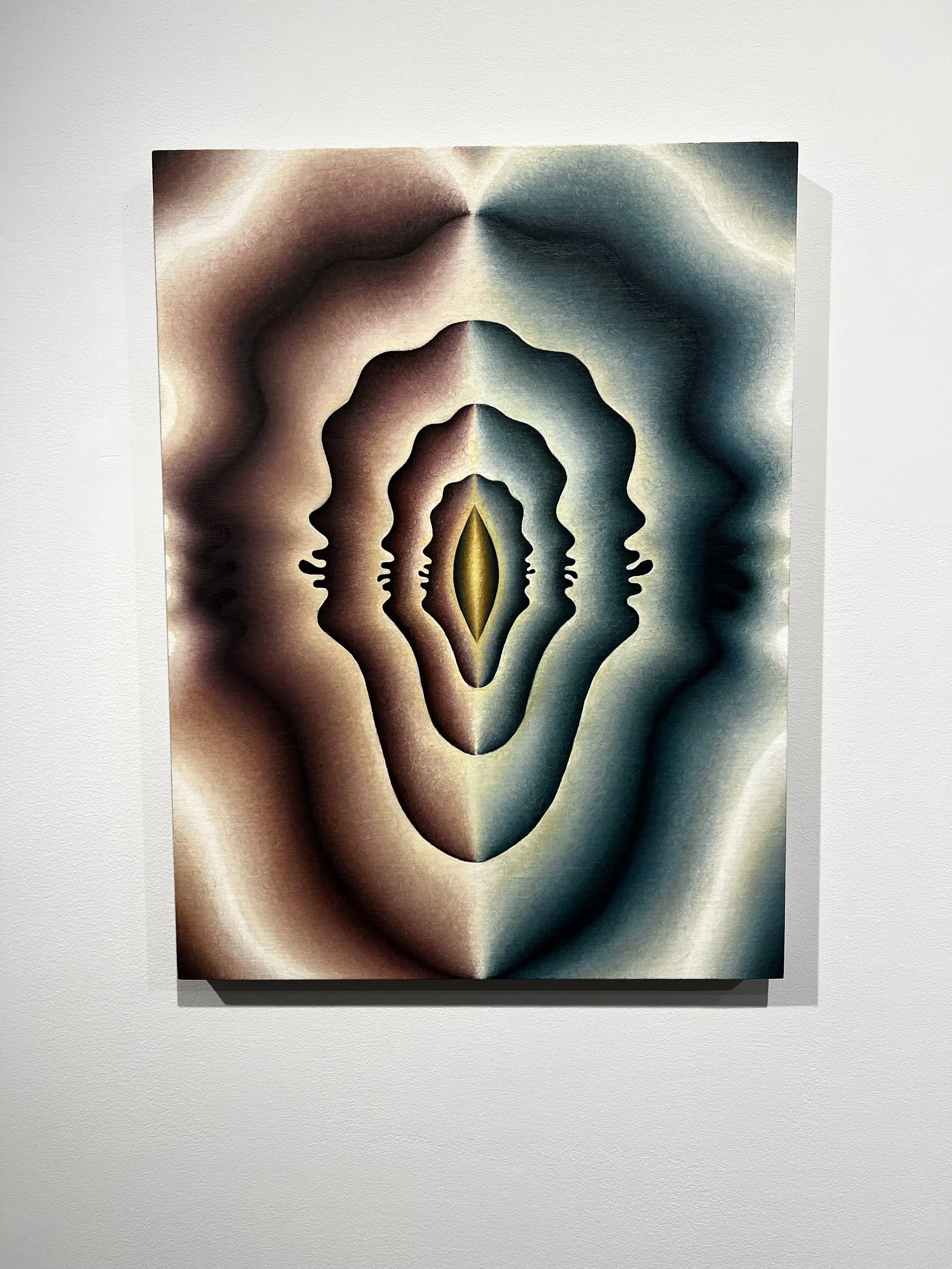 However, as is common in her creations, the focal point appears to be in the experience of light exuded by the mystical geometry at its core. The emanating light structurally modifies every element in the canvas, starting by forcing a symmetrical illusion through its central division. The light arising modifies the gradient tonality of the bodies, illuminating them from behind and within, while encapsulating them in a final radiant halo. The ambivalent treatment of the figures' curved lines and human forms act as evocative of light’s true nature as composed of both solid particles and waves. This transcendent experience consolidates into an aesthetic proposal reminiscent of Hilma af Klint’s sacred compositions.